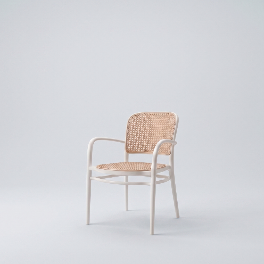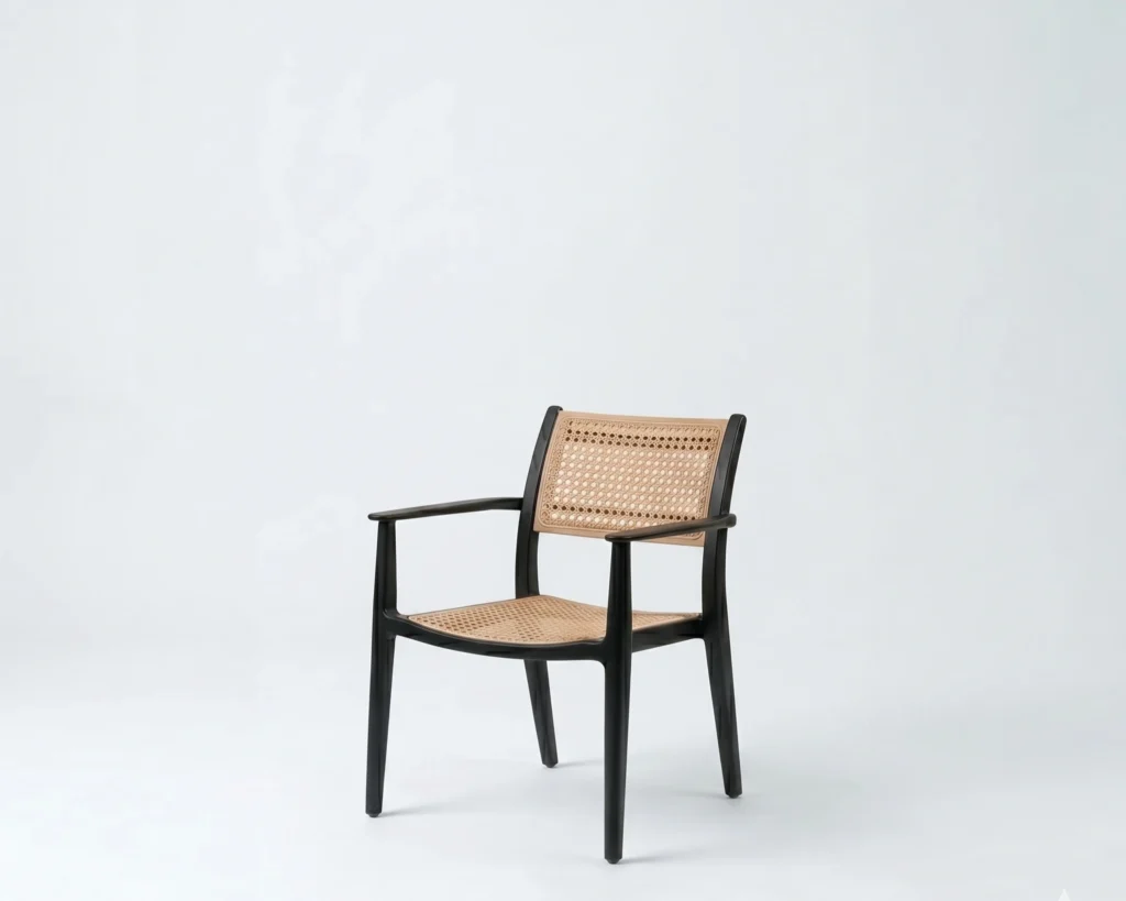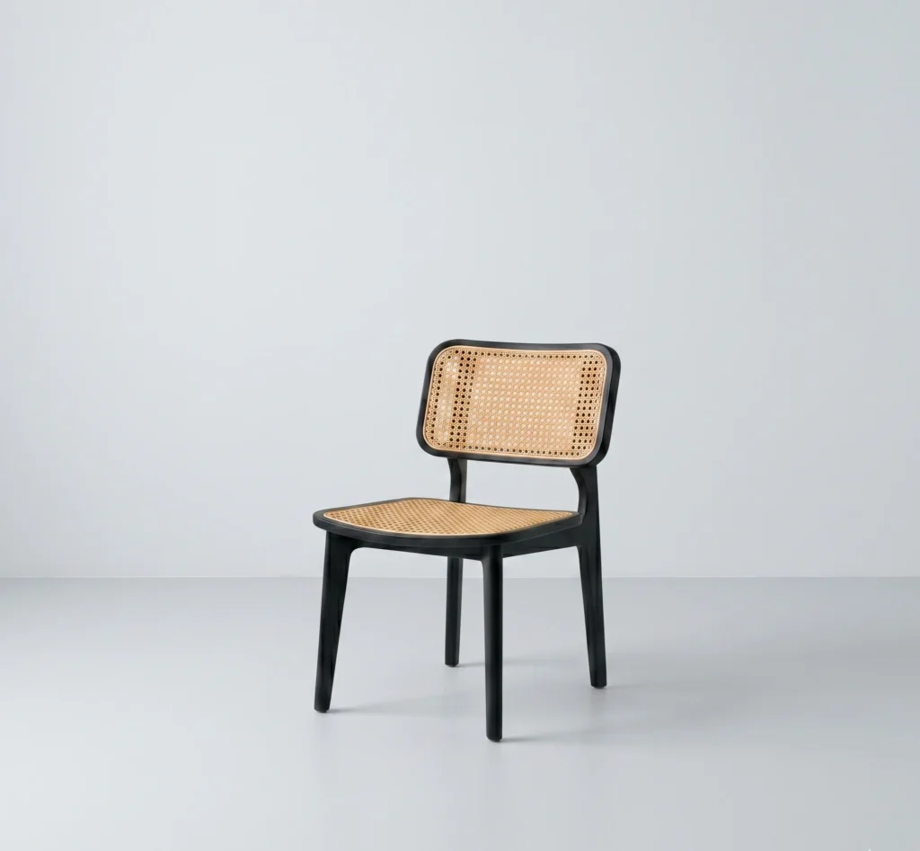 Minimalist geometry meets organic texture in this expertly crafted side chair. Featuring a sculpted bentwood frame in a deep ebony finish, this piece highlights the contrast between bold, dark lines and the airy, golden warmth of natural rattan.